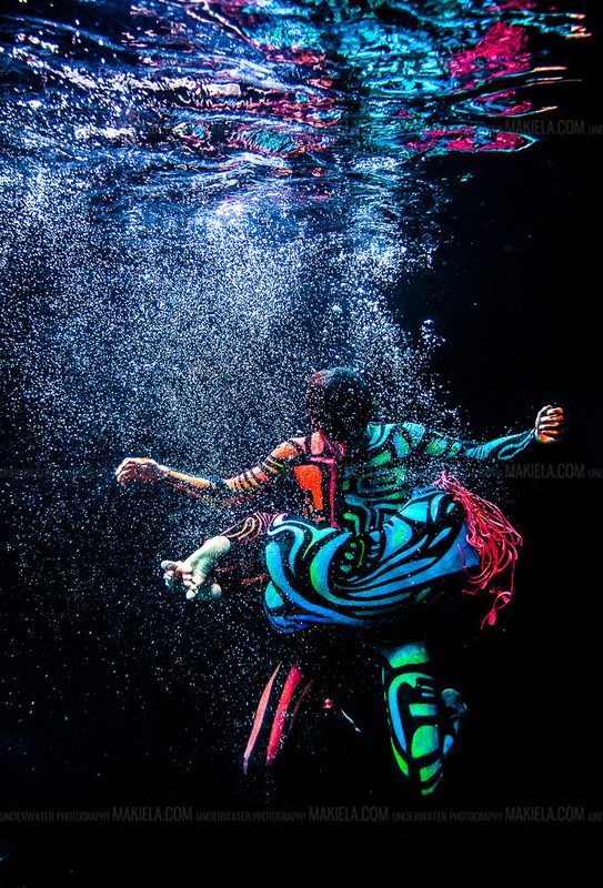 This activity assumes using scuba, so that the performers can comfortably stay under the water for a long period of time. The dance show is performed by performers who have diving skills. Aqualung can be simple just mask and gas tank with compressed air, or a full body suit. Usually it depends on the depth and temperature of water. The only and the most serious disadvantage of diving suite is its ugly gloomy appearance. All the hoses, gauges, wetsuits, fins and masks seem more like a military Navy special forces mission rather than ballerinas show. The idea to decorate the suite also fails and doesn’t give any improvements. But lovers of techno and postapocalyptic styles will like and accept it as it is.